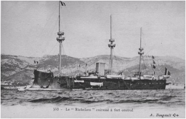 Заложенный на стапеле в Тулоне в 1869 году, «Ришелье» не был готов ко времени франко-прусской войны, и из-за связанной с ней задержки строительства, был спущен на воду лишь в 1873 году. Недостаточное послевоенное финансирование и устаревшие методики строительства французских верфей привели к тому, что корабль вступил в строй в 1876 году.